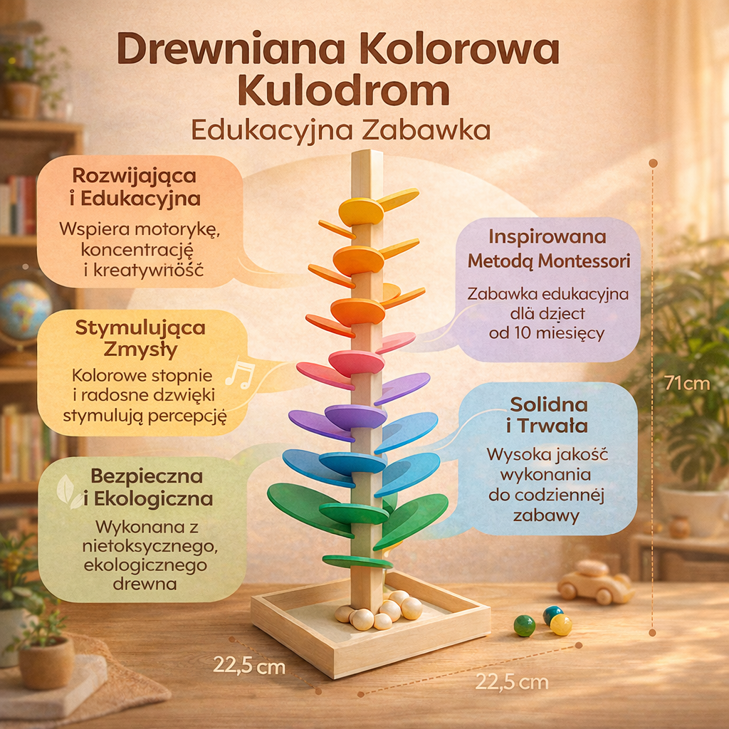 wooden toy of the marble run type designed for play and learning at home. This wooden marble run serves as an educational toy, where marbles move through levels, helping to understand cause and effect as well as gravity. Colorful parts and sounds during rolling support concentration and hand exercise. This is a Montessori toy suitable for independent play.