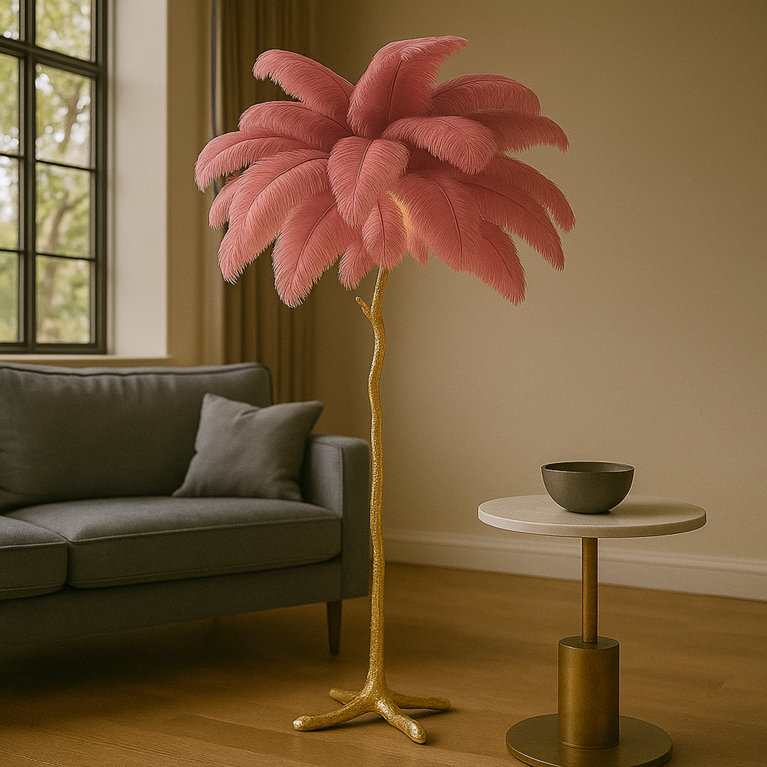 Lampa podłogowa inspirowana stylem Wabi Sabi łączy naturalny urok strusich piór z solidną konstrukcją z żywicy i mosiądzu. Dekoracyjna forma przyciąga uwagę i stanowi ozdobny element wnętrz mieszkalnych, nadając im charakteru. Model przystosowany jest do żarówek LED oraz Edison z trzonkiem E12, E14 lub G9, co pozwala na wybór źródła światła zgodnie z indywidualnymi potrzebami.