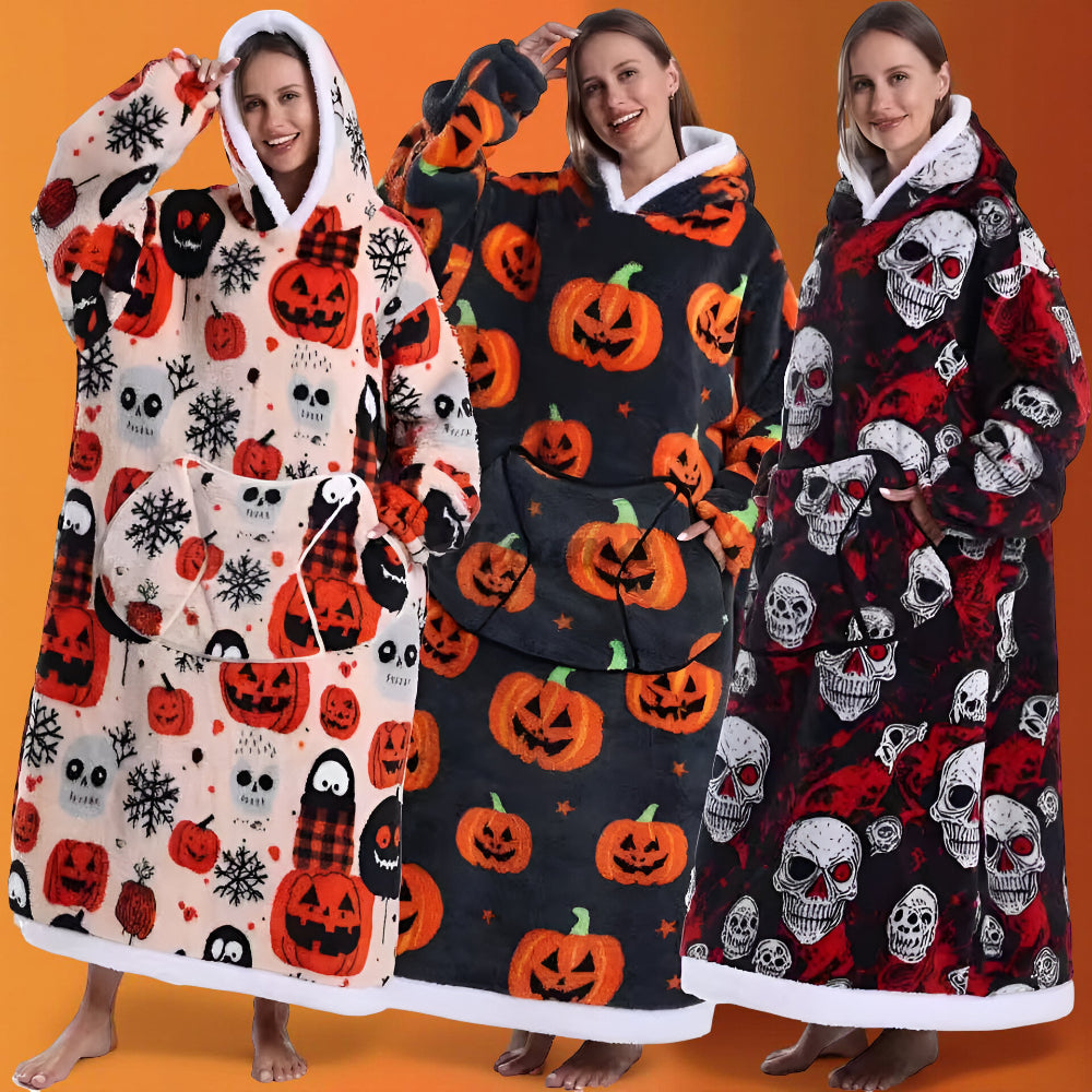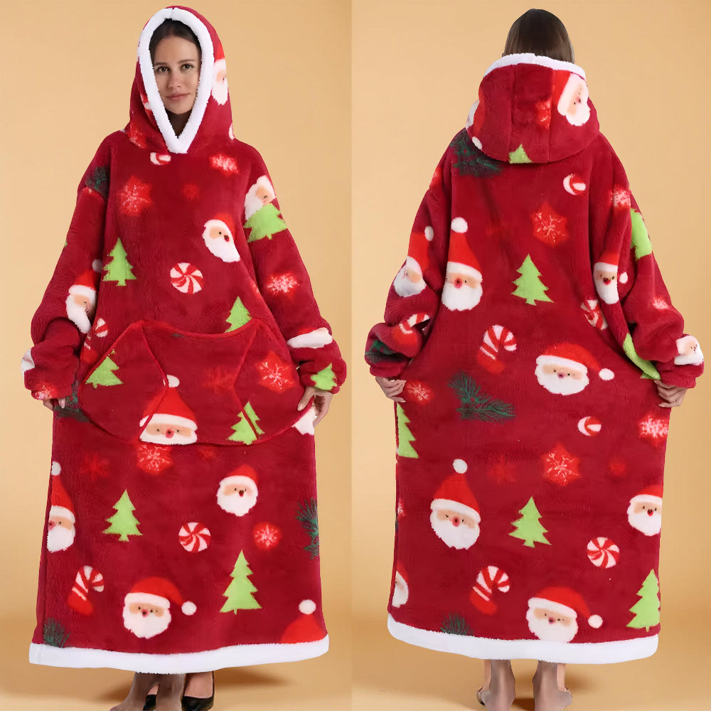 Ten koc rękawami w formie koca telewizyjnego przeznaczony jest do noszenia w domu podczas odpoczynku. Długi krój z kapturem zapewnia osłonę całego ciała podczas oglądania telewizji, czytania lub relaksu. Luźna forma pozwala na swobodne poruszanie się, a wyraziste wzory sezonowe nadają całości dekoracyjny wygląd. Produkt przeznaczony dla dorosłych, odpowiedni do codziennego użytku domowego.