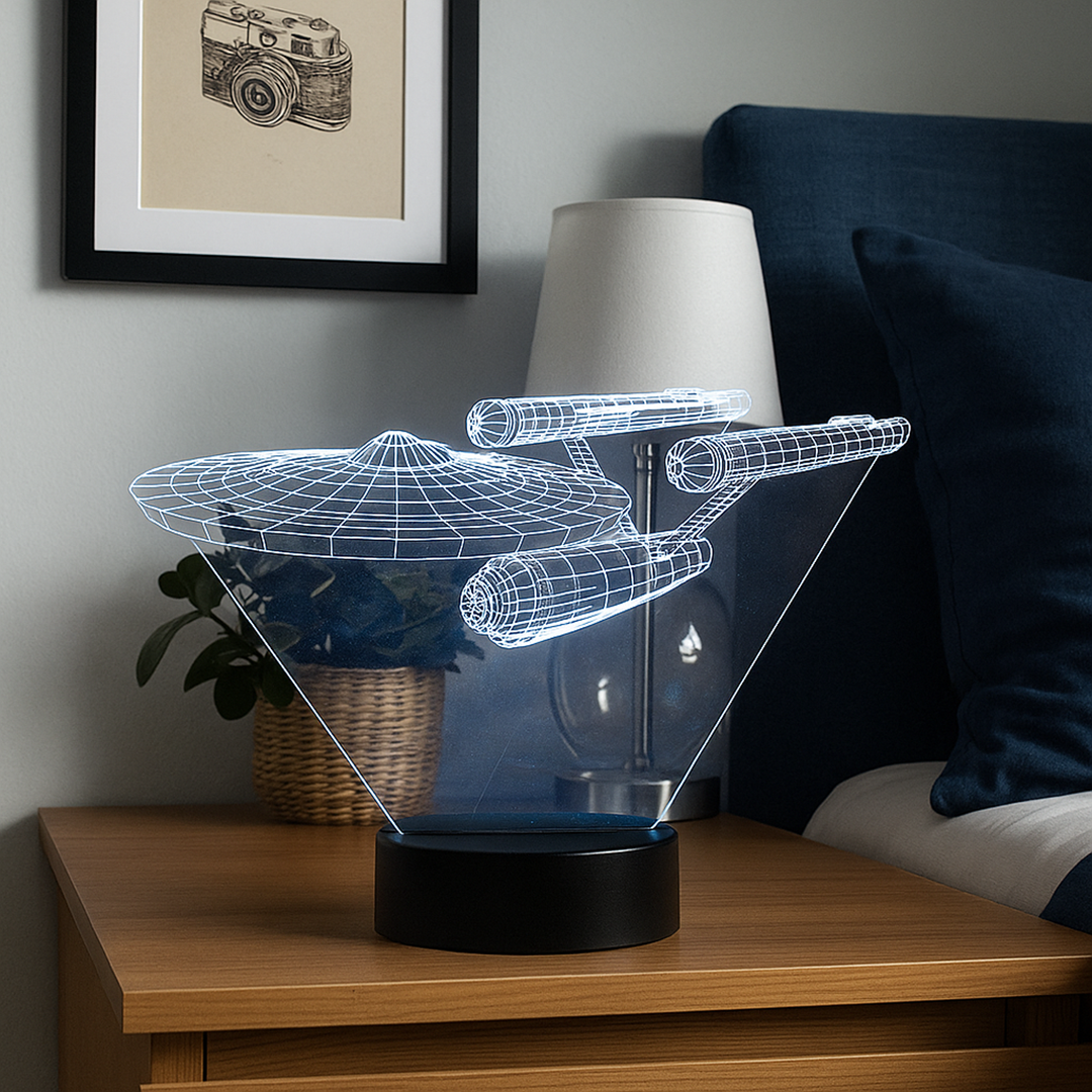 Lampa stołowa 3D w kształcie statku kosmicznego to oryginalny element dekoracyjny, który łączy nowoczesną technologię LED z futurystycznym designem. Przezroczysty panel akrylowy w połączeniu z czarną podstawą z tworzywa ABS tworzy efekt przestrzennej iluminacji, przypominający hologram. Wielokolorowe światło LED nadaje pomieszczeniu wyjątkowy charakter i podkreśla jego nowoczesny styl, sprawdzając się zarówno w pokoju młodzieżowym, jak i w przestrzeniach tematycznych.