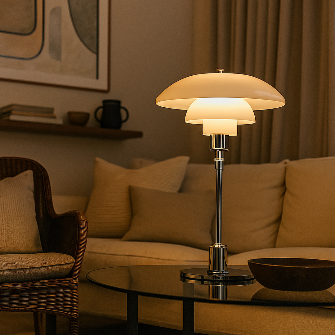 Lampa stołowa LED o nowoczesnym designie inspirowanym stylem duńskim to elegancki element oświetlenia, który harmonijnie łączy funkcjonalność z estetyką. Jej smukła sylwetka i delikatne, rozproszone światło tworzą przyjemny nastrój w każdym wnętrzu. Połączenie metalu i szkła zapewnia trwałość oraz minimalistyczny wygląd, który doskonale komponuje się z wnętrzami w stylu skandynawskim, nowoczesnym lub klasycznym. Idealna do salonu, sypialni czy biura, stanowi subtelny akcent dekoracyjny i praktyczne źródło światła.