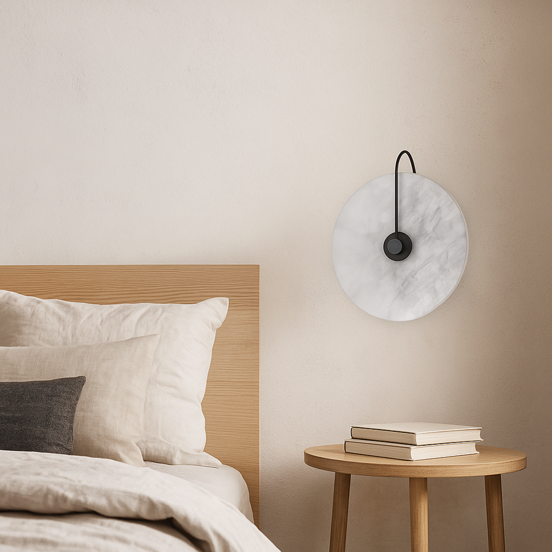 Nowoczesna lampa ścienna LED z kloszem z alabastru to połączenie subtelnej elegancji i współczesnego stylu. Okrągła forma z naturalnymi, nieregularnymi wzorami przypominającymi płatki śniegu tworzy efekt delikatnego rozproszenia światła. Ciepła barwa oświetlenia sprzyja relaksowi i nadaje wnętrzu spokojny nastrój. Smukłe, czarne ramię dodaje całości nowoczesnego charakteru, dzięki czemu model idealnie wpisuje się w aranżacje sypialni, salonu lub korytarza inspirowane minimalizmem i naturą.