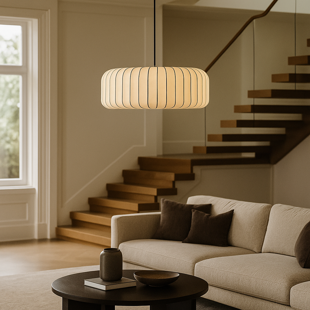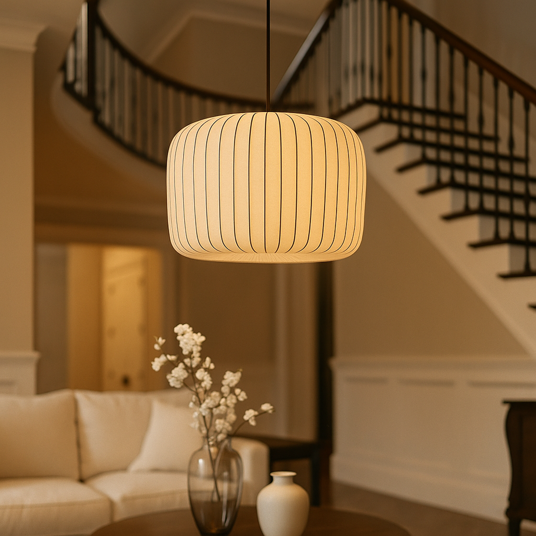 Nowoczesna lampa wisząca z tkaninowym kloszem to subtelne połączenie prostoty i elegancji, które wprowadza do wnętrza spokojną, zrównoważoną atmosferę. Klosz wykonany z delikatnej tkaniny równomiernie rozprasza światło, tworząc przyjemny, nastrojowy efekt. Minimalistyczna forma sprawia, że model doskonale komponuje się z wnętrzami w stylu japandi, nowoczesnym lub retro. Lampa doskonale prezentuje się nad stołem w jadalni, w salonie lub w sypialni, podkreślając naturalny charakter aranżacji.
