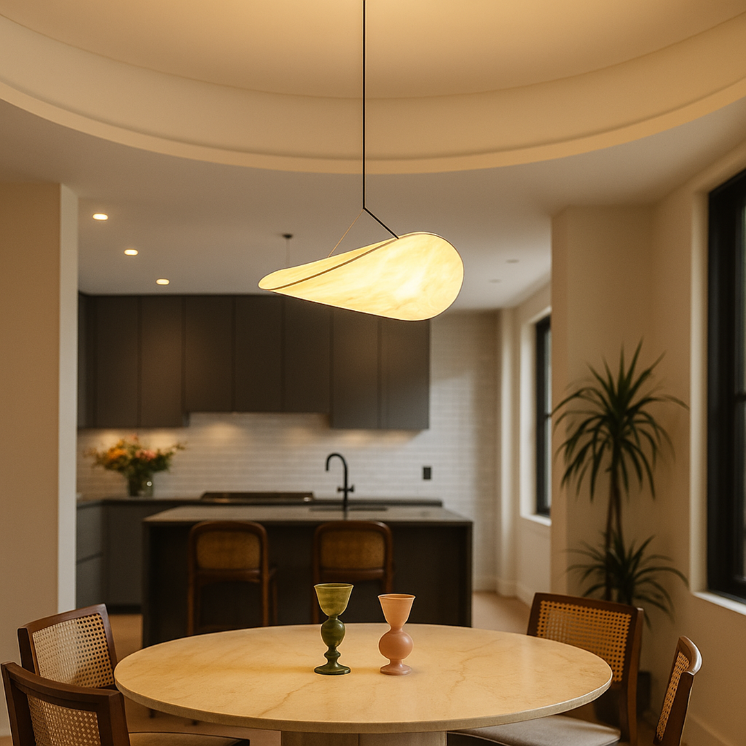Rzeźbiarska lampa wisząca wykonana z jedwabiu i metalu wyróżnia się miękką, geometryczną formą inspirowaną estetyką Wabi-Sabi i Japandi. Jej kremowy odcień jedwabnego klosza harmonizuje z naturalnym charakterem aranżacji wnętrz, dodając przestrzeni subtelnego akcentu dekoracyjnego. Dzięki swojej wysokości i możliwości regulacji zawieszenia lampa dobrze sprawdza się w jadalni, salonie oraz sypialni, stając się wyrazistym elementem oświetlenia.