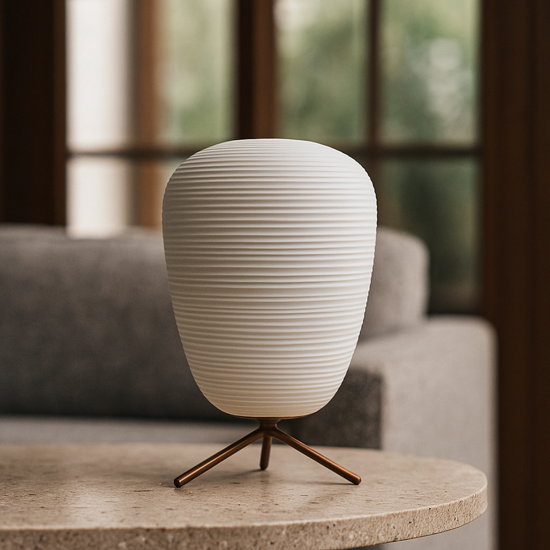Ta nowoczesna szklana lampa stołowa, inspirowana japońskimi lampionami, łączy subtelną formę z dopracowanym minimalizmem. Matowe, dmuchane szkło delikatnie rozprasza światło, tworząc nastrojową grę jasnych i ciemnych tonów. Elegancki, owalny kształt harmonijnie współgra z metalową podstawą w kasztanowym kolorze, nadając każdemu wnętrzu spokojny i zrównoważony charakter. Idealna do oświetlenia biurka, stolika nocnego lub konsoli.