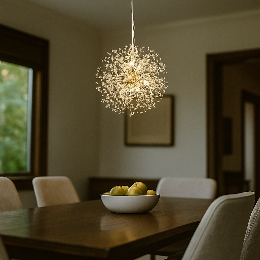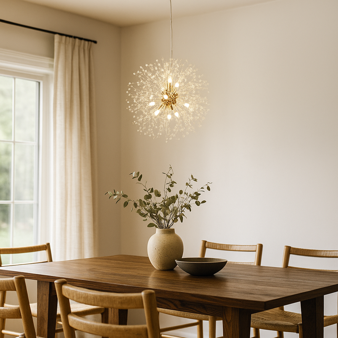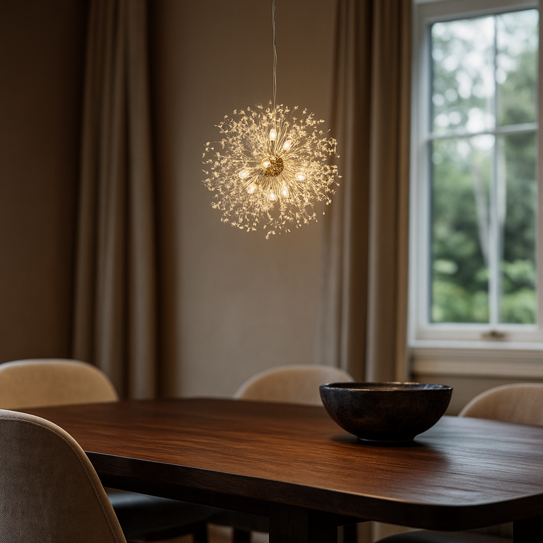 Regulowany kryształowy żyrandol inspirowany formą rozbłysku gwiazdy to połączenie nowoczesnej elegancji i subtelnego blasku. Delikatne, metalowe ramiona ozdobione kryształowymi detalami odbijają światło, tworząc efekt rozproszonej poświaty, która wprowadza do wnętrza wyjątkową atmosferę. Lampa doskonale komponuje się z aranżacjami w stylu Japandi, nowoczesnym lub współczesnym, stając się centralnym punktem przestrzeni. Dzięki regulowanej wysokości zawieszenia można ją dopasować do różnych pomieszczeń — od salonu po jadalnię.