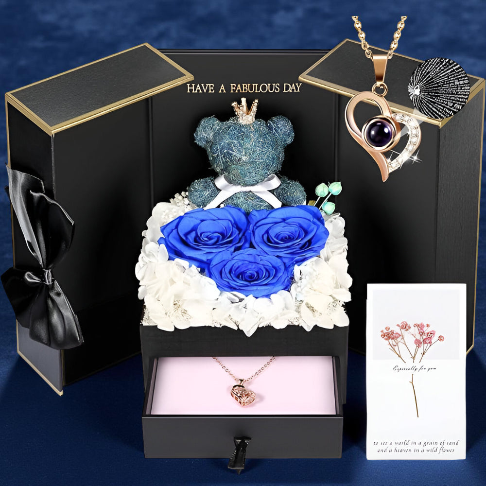 Gdy chcesz powiedzieć „pamiętam” bez długich słów, ten zestaw robi to za Ciebie. róże stabilizowane ułożone w formie serca tworzą elegancki zestaw prezentowy, a w szufladce czeka naszyjnik jako dodatkowa niespodzianka. Całość sprawdza się jako upominek na rocznicę, urodziny oraz ważne okazje, a dekoracyjne pudełko może zostać na półce jako ozdoba