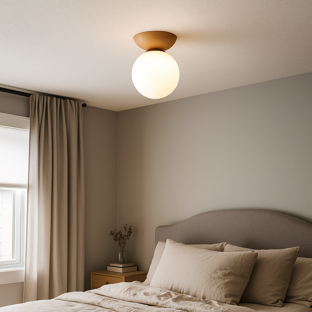 Szklana lampa sufitowa w stylu skandynawskim łączy w sobie naturalne drewno, szkło i żelazo, tworząc elegancką i minimalistyczną formę o uniwersalnym charakterze. Jej harmonijne połączenie materiałów wprowadza do wnętrza ciepło i nowoczesność, doskonale uzupełniając aranżacje w stylu nordyckim, loftowym lub nowoczesnym. Idealna do sypialni, salonu lub korytarza, stanowi zarówno źródło światła, jak i subtelny element dekoracyjny.